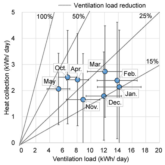 Figure 10 shows the relationship between the heat collection volume and the ventilation load, and the ventilation load reduction ratio, which is the ratio of the heat collection volume to the ventilation load. The data was calculated and evaluated for a total of one day. The figure shows the median value with standard deviation.