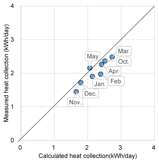 Figure 11 shows the relationship between the heat collection capacity and the ventilation load based on the simulation of heat collection capacity prediction results with daily average values. The solar radiation and ventilation load are measured values. The error was calculated by subtracting the calculated value from the measured value and dividing by the calculated value. The error between the calculated and measured values averaged 9.0%, which is a good correlation. Relatively speaking, the simulation results show slightly higher values. It is considering that that the heat collection efficiency may drop due to various factors such as shadows and dirt on the panels in the actual measurement. It was confirmed that the results were highly correlated and reproducible.