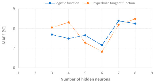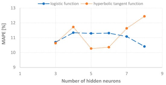 According to one of the commonly used methods for selection of the initial number of neurons in the hidden layer, which says that this number is determined as the geometric mean of the number of inputs and outputs of the neural network, the research began with three neurons in the hidden layer. Next, subsequent neurons were added, each time observing the effectiveness of the neural network for 100 draws of the training set and the error value achieved by the network for the training, validation and test sets. In addition to the optimal number of neurons in the network’s hidden layer, the selection of their activation functions is also important. As part of the research, two activation functions were considered: logistic and hyperbolic tangent, which are often used in the case of regression analysis problems. The neural network was trained using the Levenberg–Marquardt error backpropagation algorithm.