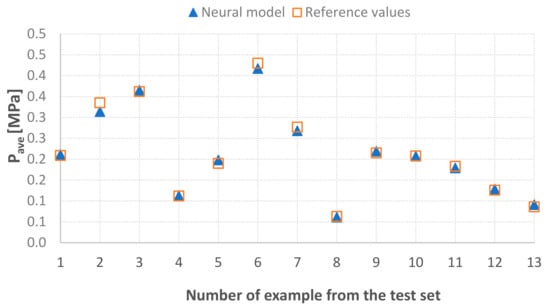 The final decision on the effectiveness of the considered neural model was made on the basis of examples of the test set consisting of 13 elements. The said examples have not been used before for the neural network training, so the results obtained on their basis could be considered reliable in the context of the network performance assessment. In the case of estimating the average methane seam pressure, the neural network prediction error in relation to the actual values determined using the sorption isotherms was at the level of 6.8% for 100 draws of the training set. For the best fit of the MLP model, an error of 2.6% was obtained in relation to the observed values of the average seam pressure. Detailed results obtained with the use of this model and the corresponding reference values of the considered parameter for examples from the test set are presented in Figure 3.