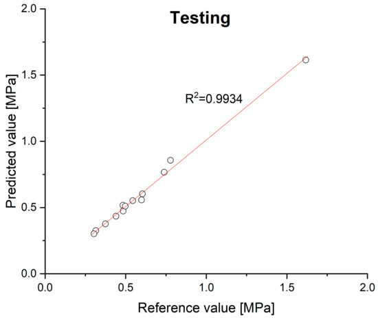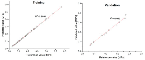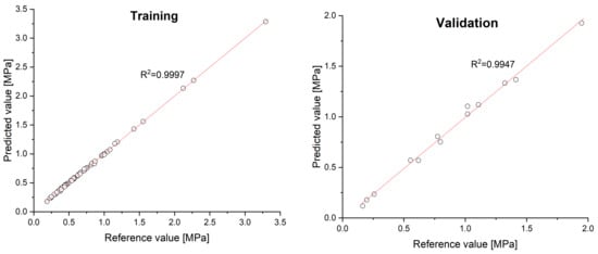 For the considered fit, the correlations between the values returned by the neural network and the reference values for the training, validation and test sets were also determined. The obtained dependencies are presented in Figure 4.