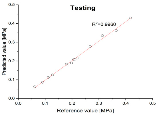 The analysis of the charts in Figure 4 shows that in each of the three stages, i.e., training, validation and testing of the network, strong dependencies between the values determined by the neural network and the designated reference values of the average seam pressure were achieved. In each case, the value of the determination coefficient exceeded 0.99, which is evidence of very good predictive abilities of the neural model developed.