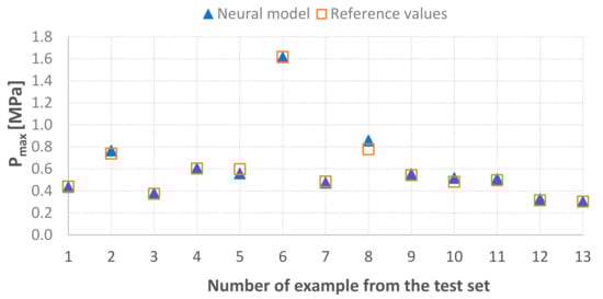 A similar procedure was carried out to assess the effectiveness of the neural model designed to predict the maximum methane seam pressure. In this case, the mean value of the neural network matching criterion, determined for 100 draws of the training set, was 10.3%, while the lowest value of the criterion (corresponding to the best fit of the neural model) was 3.04% in relation to the actual values of the maximum seam pressure. Detailed prediction results obtained for the model with the best fit and the corresponding reference values of the parameter under consideration, determined for the test set, are presented in Figure 5.