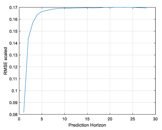 In this case, different objectives must be defined prior to MOGA execution. The minimization objectives used in this work are the RMSEs of the training set () and of the testing set (), the model complexity (OM), and the forecasting performance . This last criterion is obtained by the sum of the RMSEs along with PH (6), where D is a time series, with p data points, and E is an error matrix (7).