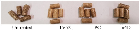 Untreated, T. versicolor 52J (TV52J), P. chrysosporium (PC), T. versicolor m4D (m4D)-treated switchgrass pellets.