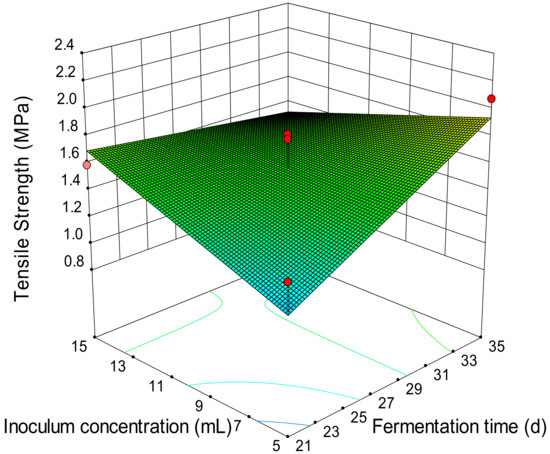 Interaction effect of inoculum concentration and fermentation time on the tensile strength of Phanerochaete chrysosporium-pretreated switchgrass pellet.
