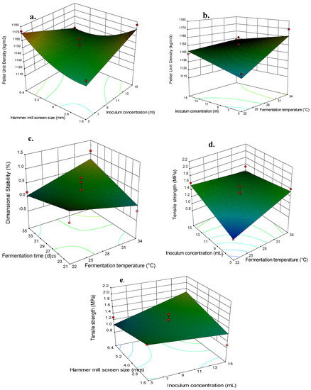 Figure 2, Figure 3 and Figure 4 illustrate the response surface curves for changes in the response variables as a function of the interaction of two independent variables with the other two independent variables at a constant level. All the interaction effects on the pellet quality presented in Figure 2, Figure 3 and Figure 4 were statistically significant. The effect of the interaction of fermentation time and inoculum concentration on the tensile strength of pellets produced from PC-treated switchgrass is shown in Figure 2. An increase in inoculum concentration up to 13 mL and an increase in fermentation time up to 31 d resulted in an increase of about 2.3-fold in pellet tensile strength, whereas a further increase in inoculum concentration and fermentation time led to a reduction in the tensile strength value of the pellet. However, high pellet tensile strengths were obtained at the lowest and highest inoculum concentration and fermentation time, respectively, and vice versa. P. chrysosporium is a known non-selective lignin-degrading fungus, and was reported to degrade both lignin and holocellulose progressively with increasing fermentation time [39]. This peculiar attribute of P. chrysosporium could be linked to the changes in tensile strength at varying fermentation time and inoculum concentration observed in this present study, which was likely due to the relative proportion of inherent binders (lignin and hemicellulose) in the fungus-treated materials. Figure 3a–d depict the response surface plots for the pellet quality of TV52J-pretreated switchgrass pellets. The interaction between the inoculum concentration and the hammer mill screen size (Figure 3a) showed that the pellet unit density decreased with the increasing of the hammer mill size and inoculum concentration. The inverse relationship between the hammer mill screen size and the pellet density observed in this work agrees with the report of the study on the effect of particle size on the mechanical properties of biomass pellets [40]. The impact of the fermentation temperature interaction with inoculum concentration on pellet unit density presented in Figure 3b indicated that the rise in fermentation temperature above 25 °C with the decreasing of the inoculum concentration caused an increase of 4.9–7.2% in pellet unit density. This result supports the assertion by Reid [41] that a minimum amount of inoculum is generally needed for the effective colonization and subsequent delignification of biomass. Hence, the solid-state fermentation of biomass using low inoculum concentrations at above room temperature favors high pellet density. Long fermentation time and high fermentation temperature resulted in higher dimensional stability (Figure 3c), whereas more dimensionally stable pellets could be obtained at the midpoint values of fermentation temperature and time studied. The impacts of the interaction of the inoculum concentration with fermentation temperature and hammer mill screen size with inoculum concentration on pellet tensile strength are shown in Figure 3d,e, respectively. An increase in inoculum concentration and fermentation temperature had a positive impact on the tensile strength, while a decrease in hammer mill screen size and inoculum concentration led to an increase in the pellet tensile strength. The effect of the interaction of factors on the pellet quality for M4D-pretreated switchgrass was recorded for only the pellet unit density and tensile strength (Figure 4a–d). As shown in Figure 4a, a low pellet unit density was recorded at a high inoculum concentration and a small hammer mill screen size, whereas a decreasing inoculum concentration and an increasing fermentation time resulted in a high pellet unit density (Figure 4b). A similar trend was observed for the interaction between inoculum concentration and fermentation temperature (Figure 4c). Unlike the pellet unit density, the interaction effect of fermentation time and inoculum concentration on tensile strength presented in Figure 4d shows that the highest tensile strength value was obtained at the midpoint of the two factors with the range of values evaluated in this study.