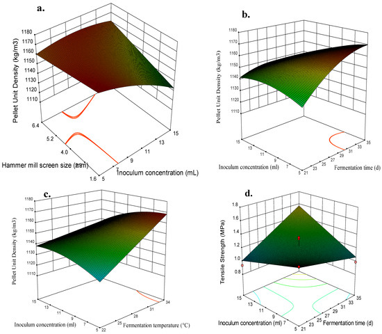 Response surface and contour plots for all responses of T. versicolor m4D-pretreated switchgrass pellets: (a) hammer mill screen size vs. inoculum concentration on pellet unit density; (b) hammer mill screen size vs. inoculum concentration pellet unit density; (c) inoculum concentration vs. temperature on pellet unit density; (d) inoculum concentration vs. fermentation time on tensile strength.