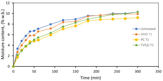 Moisture absorption during the storage and transportation of biomass pellets affects their durability and energy value [45]. The graph of moisture content and time during moisture absorption when pellets were placed in the controlled chamber is presented in Figure 5. After the first 1 h of exposure to humid conditions (RH = 90% at 25 °C), the pellets produced from the untreated switchgrass grind showed the least hydrophobic attribute with a moisture content of 7.11%, followed by M4D- and TV52J-treated pellets with 6.6% and 5.47% moisture contents, respectively. The highest hydrophobic behavior occurred in the PC-treated pellets, with a moisture content of 4.98%. Pellets from the untreated, M4D-treated, and TV52J-treated switchgrass exhibited similar hydrophobic behavior after 5 h of exposure in humid conditions. The moisture content-time graph revealed an approximately equal equilibrium moisture content (Me) of 10% for pellets produced from the untreated, M4D-treated, and TV52J-treated switchgrass, while the value of Me for the PC-treated pellets was approximately 9.2%.