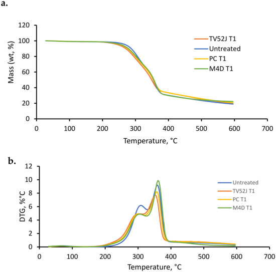 The TGA of untreated and fungal-treated switchgrass grinds was carried out in a TGA/DTA Q500 model instrument (TA Instruments, New Castle, DE, USA). The thermal properties of 10–20 mg of the samples were investigated from ambient temperature to 600 °C at a temperature ramping rate of 10 °C/min in a nitrogen environment. The flow rate of nitrogen was 60 mL/min.