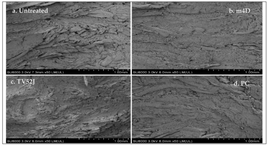 Scanning electron microscope images of the longitudinal cross-section of the untreated and fungal-treated switchgrass pellets: (a) untreated switchgrass; (b) T. versicolor m4D-treated switchgrass; (c) T. versicolor 52J-treated switchgrass; (d) P. chrysosporium-treated switchgrass.