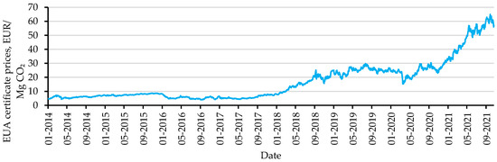 Prices of CO2 emission allowances in 2014–2021. Authors’ study based on [26].