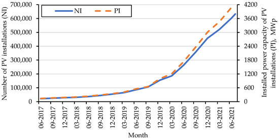 Analysing the current situation on the photovoltaic market in European countries with a temperate climate, Poland, immediately after Germany and The Netherlands, has the largest PV market [27]. With an estimated annual insolation value of 1000 kWh/m2 [28,29], the Polish photovoltaic sector is the fastest-developed renewable energy sector—with a total capacity of micro-installations of 4075.5 MW (data as of 31 June 2021). Comparing this with the total installed capacity as of 30 June 2017, it indicates almost a 25-fold increase in less than 4 years (Figure 2) [30]. As a result, Poland ranks fifth in terms of creating new PV installation capacities, closely behind Germany, Spain, The Netherlands, and France. Forecasts show that PV installations will continue to be popular in the future, and installed capacity may, with conservative estimates, increase by around 5–7 GWp by 2030 [31] and by around 10–16 GWp by 2040 [32,33].