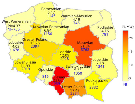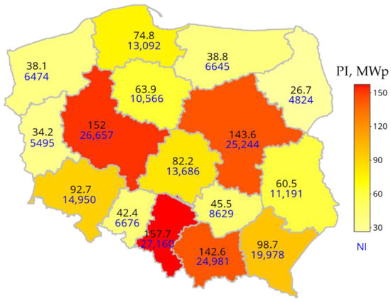 The results of the 1st round of recruitment for the “My Electricity” program (carried out in 2019) number of installations (NI) and power of installations (PI). Authors’ study based on [46,47,48].