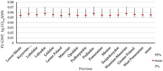 As can be inferred, FU-GWP differs between provinces, first on the basis of various productivity of PV installation and then transport distances. The correlation between yearly electricity productivity can be observed on the base of Table 1 since the provinces such as Lower Silesia, Opolskie, Silesian, characterised by the highest productivity represent the lowest FU-GWP indicators. The outcomes of calculations are comparable to previous studies on PV systems working in temperate climate conditions [67,68,69], and smaller FU-GWP indicators result from the higher efficiencies of the analysed PV panels. At the same time, the calculated emission rate is similar to the literature results of the carbon emission rate for PV installations working under similar solar irradiation (1222 kWh/m2/year, Germany), equal to 55 g CO2eq/kWh [70].