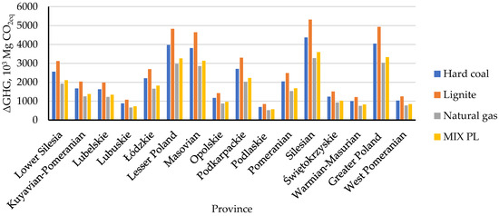 ΔGHG, Mg CO2eq, calculated for provinces in Poland in 30 years perspective on the basis of individual GWP differences for the energy sources considered to be replaced, kg CO2eq/kWh.