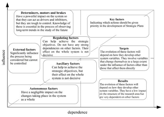 Structural analysis is a method that helps to structure ideas on this subject. It provides the possibility of describing a system by a matrix connecting relations between chosen components. By studying these relations, the method provides the opportunity to reveal the variables essential to the system’s evolution. It is possible to use the technique alone (as a help for reflection and/or decision making) or as a more complex activity (scenarios). The decisional structural analysis used as a tool of representation of players’ games is very well presented in the book of Tenière-Buchot []. Godet [] created the MICMAC Forecasting method and software suitable for analysing it. Based on the qualitative independent judgment of a group of experts, the method allows one to define the influences of the appointed variables and their dependence on the other variables. The group of experts should be as multidisciplinary as possible, however, its competencies should coincide widely with the topic of a study. The final results place all appointed by the group of experts and assumed to be crucial parameters in the space of influence-dependence (Figure 1). The horizontal axis is the axis of dependencies and the vertical axis is the axis of influences. The most important is the possibility of defining those variables that strongly influence others or depend strongly on others. If the influence value is high, it means that by changing those variables, we can improve or worsen key factors. Especially important is a strong influence on the variables strongly dependent on others. Otherwise, it can be said that factors characterised by the low influence and low dependence are not important, but the possibilities of indicating them might be crucial due to further activities. The groups of factors set on the surface of influence-dependence (Figure 1) possess their typical features: