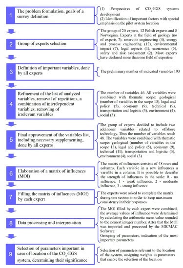 The survey was carried out in 9 steps described briefly in Figure 2. It started with problem definition and a description of the goals of the survey. The primary target is to point out the most important variables of the CO2-EGS system and find a relationship between them. Special emphasis is put on variables that are important for system location. The survey was held based on the experience of a group of experts. A group of 20 experts was chosen. The experts were drawn from the two nations that were subjects of the survey, that is Poland and Norway, the group containing 12 Polish experts and 8 Norwegian experts. The fields of experience of the experts were different, and each expert was able to indicate more than one field of experience. In the end the group of experts contained 7 experts on geology, 4 experts in the field of reservoir engineering, 12 experts on environmental impact assessment, one expert on the legal aspects related to mining matters and requirements, 5 experts on economic matters, and 2 experts on risk assessment. At the preliminary survey stage, the role of each expert was to rethink the problem and goals described and indicate at least 10 variables that influenced them. Depending on the stage of the surveys, 193 important variables were defined and some of the repetitions were removed. The list of variables was analysed to remove logical repetitions, combine independent variables by creating new ones, and remove variables obviously falling out of the scope of the survey. The target in that case was to reduce the number of assumed variables keeping sense of the main ideas. After that stage of the survey, all the experts could express their opinion on whether they approved of the new reduced list of variables or not. They could also add new variables if it was felt necessary. Based on the opinion of the Norwegian experts, the list of variables was extended by 2 variables related to offshore technology, very important in the case of Norway but almost unimportant in Poland. Finally, the list of variables that seem to be important included 48 variables. The variables were combined in the range of interdisciplinary thematic groups: geological (containing 13 variables), legal and policy (5 variables), economy (9 variables), technical (11 variables), transportation and logistics (3 variables), environment (4 variables), and social (3 variables). The list of variables indicated and finally selected by the experts is attached in Table 1. Appendix A extends the description of variables and provide additional explanations. Based on the list of variables indicated and considered as important, a matrix of influences (MOI) was constructed (Figure 3). MOI contains the list of variables in the first column and the list of the same variables in the first row. The task of each expert was to estimate how each variable in the row influences variables in columns. An expert judged the influence of one variable on another by choosing a weight of influence in the range of 0–3, where values 0 means no influence, 1—weak influence, 2—moderate influence, and 3—strong influence. The method used in the MICMAC software allows one to set a value of influence as potential influence “P”. In the work presented, it was assumed that experts would only use quantitative values of influences, excluding “P”. It is worth emphasising that the adopted method of filling the matrix causes it to not be symmetrical in relation to the diagonal. For example, variable no 39 (The degree of urbanisation of the area—Table 1) strongly influences variable no 3 (Quality of air—Table 1), so the value of the influence weight was determined to be 3 (Figure 3). On the other hand, the impact of variable 3 on variable 39 was assessed as weak, equal to 1 (Figure 3). The diagonal is filled by 0, but in fact is disregarded by the program. The MOI was filled by all the experts individually in as short a period of time as possible. After that, all the data were combined, and the final MOI was presented. Values were assigned by calculating arithmetic mean values, rounded to the nearest integer.