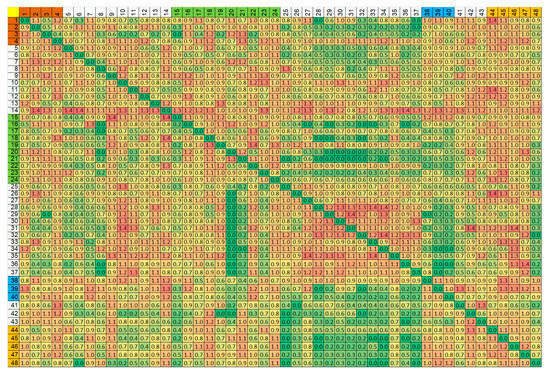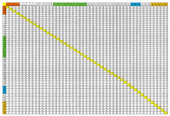 The variables in Table 1 are marked by colour, depending on their classification to the thematic scope. The same colour scheme is used in Figure 3 and Figure 4, where variables ID number is placed in the first row and column.