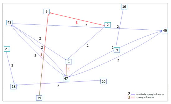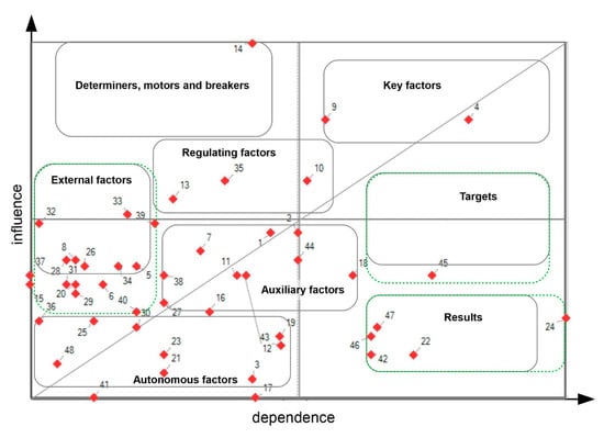 Figure 5 shows the diagram of direct influences. The location of variables was determined as a result of data processing by the MICMAC software. Additionally, the original graph was supplemented on the ranges of parameters groups located at typical places on the dependence-influence surface (Figure 1). The range of the “External factors” and “Targets” groups in Figure 5 are slightly extended in the lower values of influence when compared to Figure 1. The “Results” group is extended to higher values of dependence. The extended ranges are marked with a green dashed line. Extending the scope of the data can be considered as a preliminary interpretation of the data. Variables that were originally outside the ranges typical for each group were included in specific groups on the basis of the authors’ judgement. However, it should be remembered that the method determines the position of the variable groups (Figure 1) in an approximate manner.