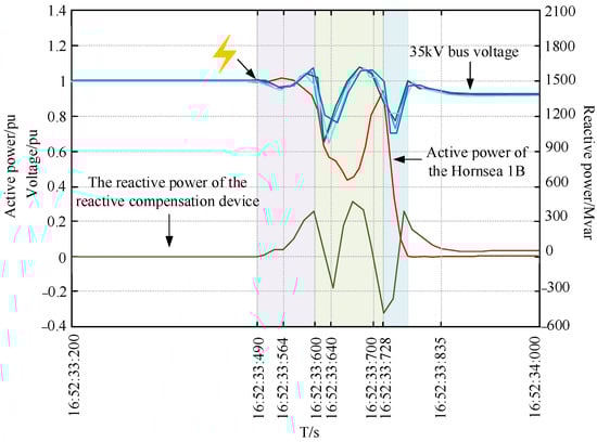 - During the simulation time of 3.590–3.695 s, within the BC interval, the voltage of the 35 kV bus of the wind farm drops nearly 35%, and the wind turbine enters the low voltage traversal mode. The active power output of Hornsea 1B drops to about 200 MW and then recovers. It corresponds to that at 16:52:33:600–16:52:33:728, when the active power output of the wind turbine was reduced by about half and then restored.