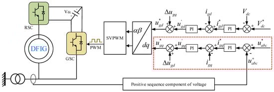 Since the sub-synchronous oscillation event of the Hornsea wind farm is caused by the asymmetric drop fault of power grid voltage, there are many asymmetric components and sub-synchronous components in the system. Hence, it reduces the system control accuracy, making it more difficult to suppress the sub-synchronous oscillation and increasing the dynamic coupling between the equipment and the power grid [22,23,24,25,26]. If DFIG control systems do not consider the voltage unbalance, the stator currents can become highly unbalanced even with the small voltage unbalance. The unbalanced currents create unequal heating on the stator windings and oscillations of torque and output power. Control and operation of DFIG systems during network unbalance have been studied in [27,28]. They aim to control the negative sequence current for eliminating the torque and/or power fluctuations; however, contributing to network support is not considered, which is very important [29]. Therefore, it is urgent to explore the voltage compensation capability of the Hornsea wind power system during asymmetric faults to support the recovery of the grid voltage. In reference [30], the current loop control strategy of the doubly-fed induction generator is changed based on positive and negative sequence decomposition to deal with unbalanced network voltage conditions and improve system stability. However, there are problems in the parameter coordination of positive and negative sequence PI regulators in practical application. Literature [31] points out that when asymmetric faults occur, the asymmetric faults can be simplified to symmetric faults by simply compensating the positive sequence voltage to the required reference voltage value, which simplifies the control strategy of the system.