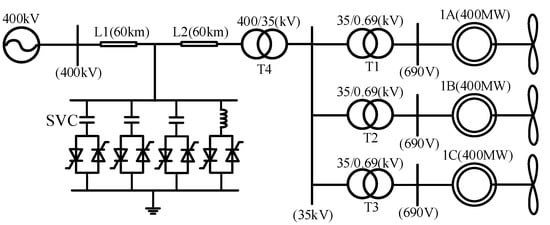 MATLAB/Simulink is widely used in complex simulation and design of control theory and digital signal processing because of its wide adaptability, clear structure and flow, fine simulation, being close to reality, high efficiency, and flexibility. According to the introduction of Hornsea wind farm given in the reports [1,2,3], this paper establishes a 1.2 GW Hornsea wind farm system simulation model on MATLAB/Simulink simulation platform, as shown in Figure 6. The Wind farm is divided into three parts: Hornsea 1A, Hornsea 1B, and Hornsea 1C, each with a capacity of 400 MW. Each unit contains 267 doubly-fed induction generators with a rated voltage of 0.69 kV and rated power of 1.5 MW. The wind farm transmits power to the power grid through 120 km high voltage AC submarine cable, with cable resistance of 0.0205 (Ω/km) and reactance of 0.0798 (Ω/km). In this simulation model, the short circuit ratio of the grid-connected point of the wind farm is about 2.8, which belongs to the weak AC system. The intermediate node of the submarine cable is equipped with TSC-TCR type SVC, which consists of a 327 Mvar thyristor control reactor and three 282 Mvar thyristor switched capacitors. It uses constant voltage control and has a voltage PI controller with kp_svc of 5 and ki_svc of 800.