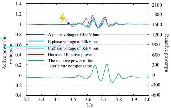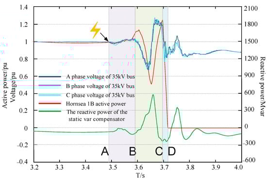 - During the simulation time of 3.490–3.590 s, within the AB interval, the maximum drop of the 35 kV bus voltage of the Hornsea wind farm is approximately 4%. This corresponds to a 5% drop in the voltage of the 35 kV bus within 16:52:33:490–16:52:33:600.
