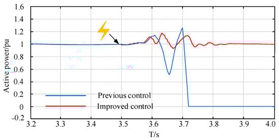 Combined with Figure 10 and Figure 11, it can be seen that the improved control strategy can effectively promote the stabilization of wind turbine terminal voltage. Under the previous control, the terminal voltage of the wind turbine generator drops to 67.8% of the initial stable value at its lowest point. Under the improved control strategy, the terminal voltage drops to 93.7% at its lowest point. The voltage oscillation amplitude is reduced significantly, which improves the system stability and provides a more stable grid voltage for wind turbines.