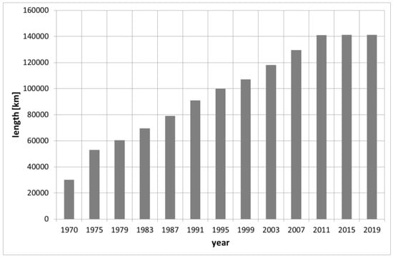 Established in 1982, the European Gas Pipeline Incident Data Group (EGIG) [4], which currently brings together seventeen operators of European transmission networks, reported that, in 2000, the total length of pipelines in Europe was just over 100,000 km. In 2019, this number increased to just over 143,000 km (cf. Figure 2).