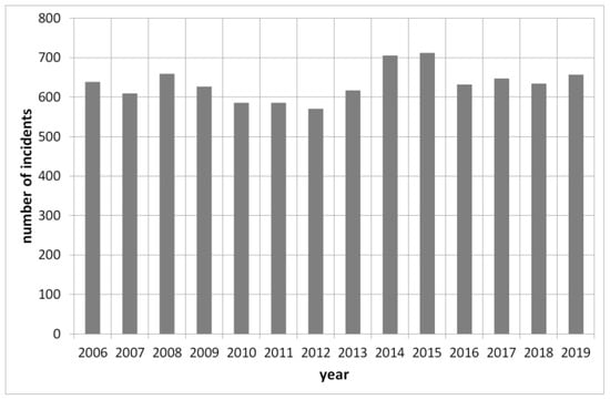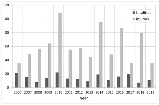 The next two figures show the U.S. data on the number of incidents (Figure 4) and the number of casualties (killed and injured) in 2000–2019 (Figure 5) [3,5].