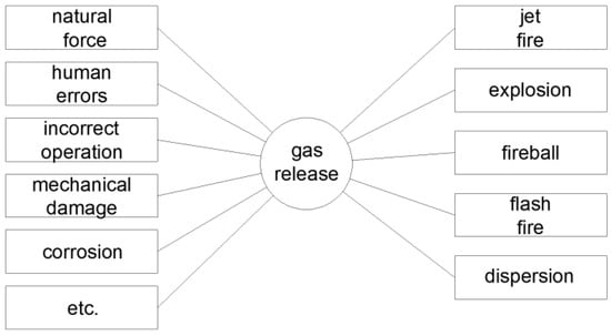The dangerous effects of events triggered by natural gas leakage and ignition intensify if damage to the gas network occurs in a populated area. Failures also involve economic losses incurred by businesses due to interruptions in gas supply. The kind of hazard created depends on the course of the failure, the cause and type of damage, the gas pipeline size, etc. An important factor affecting the development of a scenario in which a hazardous event is triggered by a leakage of natural gas is the presence of ignition sources in the leakage area and the moment when a cloud of the released gas ignites. Immediate ignition results in a fire, whereas delayed ignition results in an explosion (Table 3). If there is no ignition, the released gas disperses into the atmosphere (cf. Figure 7).