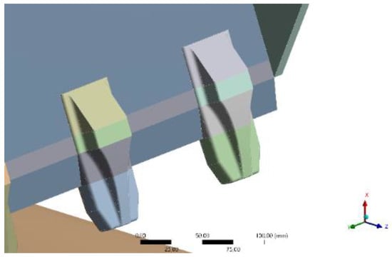 A 600 mm wide excavator bucket made of a 10 mm thick metal plate was assumed. The leading edge was 3 mm thick. It was equipped with four teeth with a profile adopted from the catalogue data of the CAT company, Stockton, CA, USA (cf. Figure 8). The numerical model used a section of the bucket, mapped as a rigid body.
