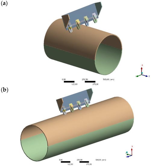 The numerical mesh of the pipeline consists of 10 × 10 mm hexahedral elements. The pressure of 5 MPa on the pipeline inner surface was assumed as the boundary condition. The pipeline was restrained at both ends and on the surface of the bottom half of the pipe using the fixed-support method. Three variants in the positioning of the excavator bucket in relation to the pipeline were considered (cf. Figure 9):