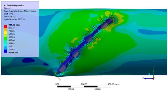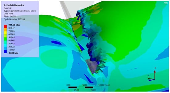 A simulation was also performed for Variant 1 and Variant 3 of the development of the pipeline damage after the bucket hits the pipeline and then rotates further in relation to the machine arm. Such a situation occurs if the excavator operator does not notice or fails to respond to the bucket first hitting against the pipeline and continues their work. In these calculations, the rotation point was assumed to be at the distance of 300 mm from the bucket’s centre of gravity. In this variant, the bucket, as a rigid body, rotates at a set angle of 45°. The effects of pipeline destruction for Variants 1 and 3 are shown in Figure 13 and Figure 14, respectively.