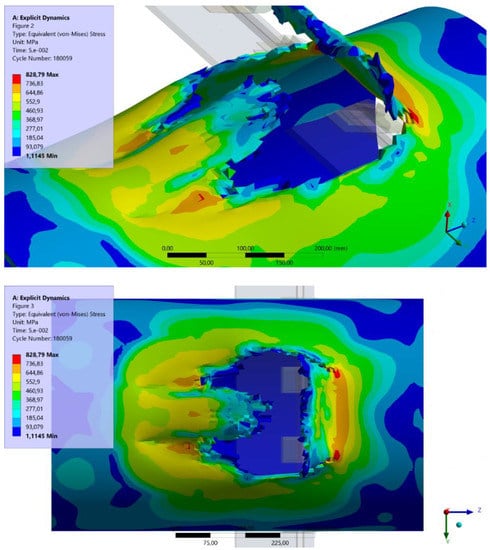 To estimate the consequences of such an event, the impact of an excavator bucket on a medium-pressure gas pipeline was simulated. A pipeline with a diameter of 0.5 m, a wall thickness of 10 mm and a gas internal pressure of 5 MPa was assumed for the analysis. The material elastic-plastic behaviour and the material destruction were simulated using the Johnson–Cook model described, among others, in [26,27].The calculations were performed in the ANSYS software [28].