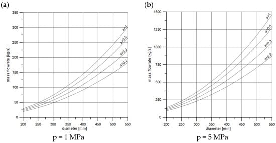 Mass flow through the hole (puncture/rupture) in the pipeline for various gas pressures in the pipeline: (a) p = 1 MPa and (b) p = 5 MPa.