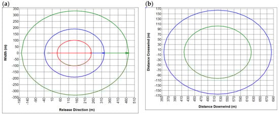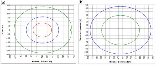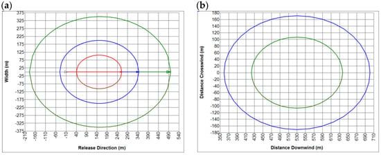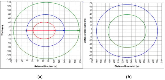 The zones shown in the figures are related to the effects of a fire and an explosion in the form of a heat flux and overpressure, respectively. In Figure 16a, Figure 17a, Figure 18a and Figure 19a, the red lines represent zones with heat fluxes above 37.5 kW/m2, the blue lines represent those at 12.5 kW/m2 and the green lines represent those at 4 kW/m2. The values of 4, 12.5 and 37.5 kW/m2 are defined as the limits of the heat flux values, which, if exceeded, result in pain, first-degree burns and human death, respectively. In Figure 16b, Figure 17b, Figure 18b and Figure 19b, the green lines show the zones with overpressure above 0.344 bar and the blue lines show the zones above 0.16 bar. The overpressure values of 0.16 and 0.344 bar, respectively, are the lower limits of pressure causing structural damage and damage to human lungs. The results shown in Figure 16 and Figure 17 pertain to the cases where the area of damage is equal to 20% (a = 0.2) and 50% (a = 0.5) of the pipe diameter, respectively.