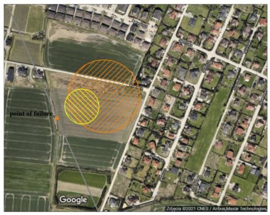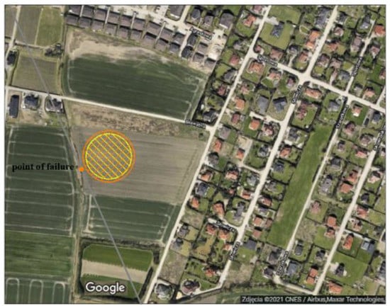 All of the zones are presented for the least favourable scenarios of failure, i.e., for those where the range of the effect of a given phenomenon is the greatest. In the case of a fire, this is the immediate ignition of a jet of natural gas released under high pressure. In the event of an explosion, this is a delayed ignition with the largest mass of the gas–air mixture formed, with a concentration corresponding to the lower explosive limit.