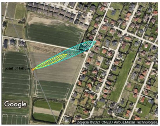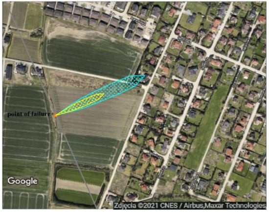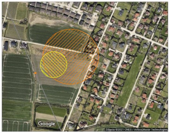 As already mentioned, the negative effects of a fire or an explosion of natural gas released from the pipeline are much more dramatic when the pipeline is located in populated areas. Examples of such a hypothetical localisation of the gas leakage are presented in Figure 20, Figure 21, Figure 22, Figure 23 and Figure 24. The hazard zones arising due to the heat flux generated from a fire caused by natural gas released from an example pipeline are shown in the figures below. The distance of the failure site from built-up areas is approximately 150 m. The zones marked in yellow and orange indicate the range within which the heat flux value causes human death. In the analysed scenario for a pipeline with a diameter of 0.5 m, partial damage is assumed (a = 0.2) with gas pressure values of 5 MPa (orange) and 1 MPa (yellow) (cf. Figure 20). Higher gas pressure values cause stronger outflows of the gas jet. As a result, the hazard zone moves away from the site of the pipeline failure to a certain degree. It can also be noticed that, if the damage size and the gas pressure are increased (cf. Figure 21), the range of the hazard zones becomes substantially bigger. In the case under consideration, it covers an area with buildings in the vicinity of the potential failure site.