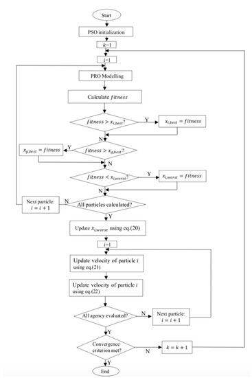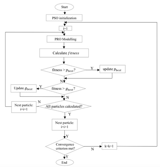Flow chart of the PSO-based maximum energy extraction algorithm for the PRO system.