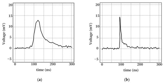 Two conditions must be fulfilled for partial discharge occurrence. (1) An initial electron must exist for ionization avalanche. (2) The electric field in the specific spot must be higher than the inception field [9]. The emission of initiatory electrons from the cathode is a stochastic process [10,11]. Thus, after the ignition voltage has been reached, an avalanche will start after a time delay τs. In practice, τs can be expected to be in the order of milliseconds, several orders of magnitude larger than the formation time of an electron avalanche [11,12,13]. In the literature, different discharge mechanisms were described with different nomenclature [11], from “Townsend-like” [14], “streamer-like” [14] to “glow” [15] “pseudo-glow” [15] and “swarming micro partial discharge” [16]. Reference [17] gives an overview of different definitions, in which the author claimed that explanations of all different PD phenomena should be studied in terms of Townsend and/or streamer discharge. Townsend discharge has the large pulse width and short height while streamer discharge has a fast rise time and short tail. Figure 1 shows a typical comparison between these two kinds of discharge. A criterion to distinguish such phenomena is proposed by different researchers, e.g., Penning claimed a streamer when the number of electrons per avalanche is between 108 and 109 [18]. Raether regarded pulse risetime less than 3 ns as an indicator for streamer [19].