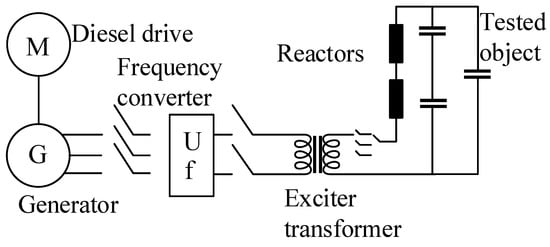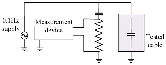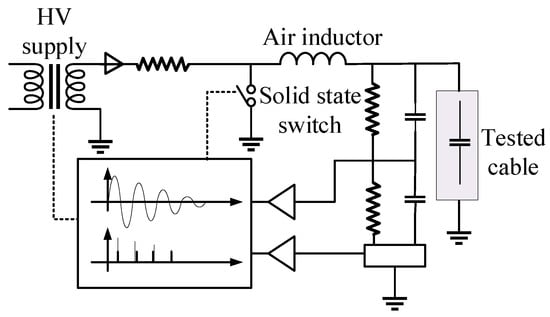 VLF: the schematic circuit for the VLF test is show in Figure 6 [80]. Since the power P demanded to energize the cable is proportional to the test frequency f as