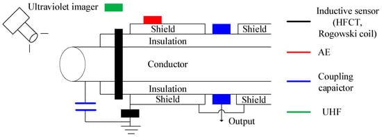 The discharge is accompanied by (1) a current caused by charge displacement; (2) radiation emitted by excited particles falling back to a lower energy state; (3) ultra-sonic sound; (4) heat generated by particle impact; (5) chemical reactions [11]. Thus, the detection can be divided as electrical discharge detection and nonelectrical discharge detection. The nonelectrical phenomena are chemical reaction, gas pressure, heat, sound, and light, from which the last two are of practical importance [105]. Photography and acoustic emission (AE) sensors can be used for detection. Dissolved gas analysis (DGA) is related to the chemical transformation. While for the electrical discharge detection, inductive and capacitive sensors are used. Refs. [106,107,108] summarized inductive coupling (a sensor that picks up the magnetic field of PD), galvanic coupling (PD signal is measured as the voltage drop across an impedance inserted into the current path), and capacitive coupling (a sensor that picks up the electric field of PD); directional coupler is also introduced as an integrated sensor in the cable joint with both capacitive and inductive coupling. When the sensor is considered by frequency range, then there are AE sensors covering the frequency in 20–500 kHz; high frequency current transformer (HFCT) with the frequency range of 30 kHz–300 MHz; very high frequency (VHF) methods which measure frequency range of 30–300 MHz; ultra-high frequency (UHF) method with window type sensor measuring frequency range from 300 to 3000 MHz [109]. Typical sensors used for PD detection along power cables are summarized in Table 4 with advantages and disadvantages. Their locations with respect to the cable system are indicated in Figure 8. The inductive sensors need a current path for PD while the coupling capacitor has issues for installation since, for example, it needs to interrupt the cable shield. AE and UHF sensors are non-contact sensors. However, the attenuation needs to be considered. An ultraviolet imager is easy to use but it can detect only corona discharge at cable termination. New progress has been made by researchers to develop novel sensors for convenient and accurate measurements in field, e.g., the spherical electromagnetic sensor [110], which is not included in Table 4.