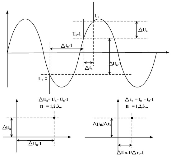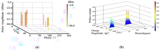 Standard quantities are used for PD analysis: inception voltage, extinction voltage; maximum and minimum PD amplitude in mV or pC. For AC test, the time and phase information of applied voltage are utilized, such as inception and extinction phase of the applied voltage (the phase interval defined as difference of the two), mean number of discharges per cycle of the applied voltage, mean integrated charge quantity, or mean integrated signal height per cycle of the test voltage [118]. Phase-resolved PD (PRPD) and phase resolved pulse sequence (PRPS) are two typical patterns to analyze PD as shown in Figure 9. The PRPD patterns show phase, pulse count, and charge magnitude information and PRPS includes PD intensity, time of occurrence, and PD phase. Another alternative approach is to consider the dynamic between consecutive PD pulses proposed by Hoof and Patsch with the name of “Pulse Sequence Analysis” (PSA) [119]. A PSA pattern is usually constructed with the instantaneous voltage differences/time difference between consecutive pulses, as shown in Figure 10. Compared to AC, the major issue for PD measurements under DC is the absence of phase information. If there is ripple in the applied DC voltage, it can be utilized to help PD analysis as a phase reference, similarly to AC [120]. For DC without noticeable ripple, one can observe only a series of impulses. Many algorithms and techniques are used for PD extraction and interpretation [121,122].