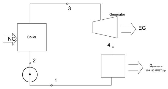 The cogeneration system will use natural gas to generate electricity. Steam will be directed into a step-down turbine for the heating system, to reduce pressure and to generate power, all at the same time. The turbine generates the electricity, and the exhaust steam from the turbine will be a supplied process (as shown in Figure 5).