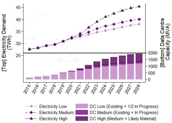 Author’s illustration based on values from EirGrid [53] forecast of electricity demand and data centre capacity.