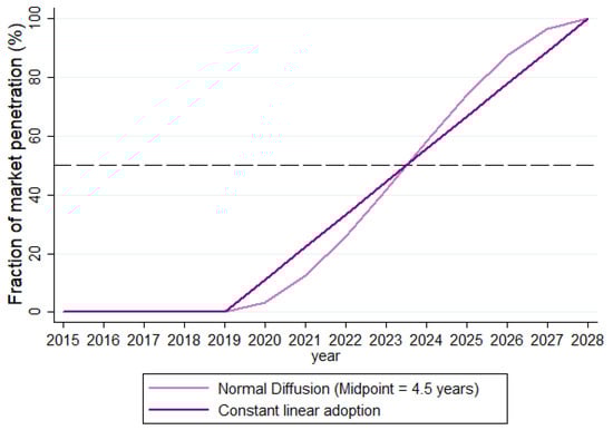 Following Equation (3), the symmetric ‘s-shaped’ adoption curve [66] is chosen as it is more representative of market behaviour than a constant adoption rate each year (Figure 1). Following this curve, initial adoption is slow, but increases as other firms observe the technology is viable. As the technology approaches full market adoption, growth slows due to saturation. Figure 2 illustrates the market adoption pattern, with adoption beginning in 2020 and ending in 2028, a nine-year period where the market reaches fifty percent saturation four and a half years into the horizon (mid 2023).