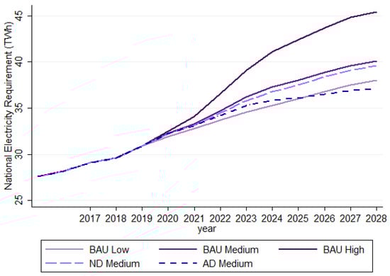 Focusing only on the final year of the horizon neglects cumulative energy savings. Over the nine-year period (2020–2028) when diffusion occurs, the ND scenario lowers energy use by 5.58. This section considers the effect of data centre technology adoption on national electricity demand. To facilitate appropriate comparison between BAU and adoption scenarios, the annual series of national electricity demand must reflect the cumulative difference between the BAU level of data centre electricity consumption and the lower forecast in adoption (ND, AD) scenarios.