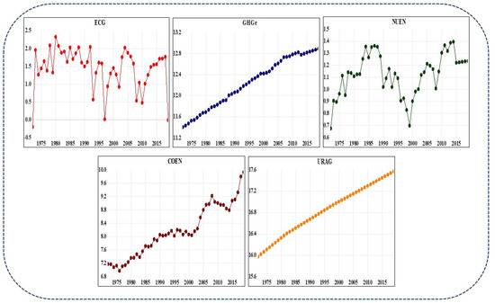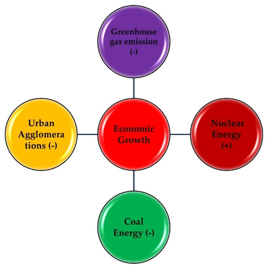 In the circular economy, resources are better used, natural systems are rejuvenated, and waste is reduced while goods and materials are maintained in use. However, the circular economy’s social implications are non-existent. Furthermore, there is no comprehensive framework for choosing social indicators to assess whether circular economy methods have a beneficial or negative effect [15]. Furthermore, environmental awareness and sustainable development are inseparable from the contemporary supply chain’s image. The quest for sustainable supply chain management may be attributed to the contemporary world’s demands. Improving a company’s image while simultaneously reducing waste, innovating, creating revenues, and gaining a competitive edge are all possible with efficient use and proper management of natural resources. The high intensity of the circular economy is linked to accreditation of environmental management systems and strategic decisions for environmental performance improvement and sustainable business models. However, managing distributed energy has enhanced the generation and delivery of more scattered energy [16,17,18]. Issues in energy policy, high power generating prices, old infrastructure, and inadequate power transmission have all contributed to the severe energy crisis. In addition to transmission loss and distribution theft, Pakistan’s power corporations have a bureaucratic culture of inadequate management and planning. The notion of energy efficiency is still underappreciated, in part because many feel that energy efficiency is a tool to decrease consumption and output rather than increase it. Due to the country’s perception that economic progress is essential to its future, energy efficiency has been seen as a euphemism for slowing growth. The current study makes a unique contribution to the existing literature and supports Pakistan’s future development plans by identifying long-term connections between energy production, activities, fuel use, and technical advancements. The findings of this research are relevant to the growing demand of energy, including coal and nuclear energy, in Pakistan in order to foster economic growth. With this motive, the current study’s major aim was to examine the interaction between greenhouse gas emissions, nuclear energy, coal energy, urban agglomeration, and economic growth in Pakistan by utilizing time series data during 1972–2019. Three-unit root tests were utilized to rectify the stationarity of the variables, while the ARDL (autoregressive distributed lag) method with long and short-run estimations was employed to reveal the linkages between variables. The Granger causality test under the vector error correction model was also employed to show a unidirectional relationship among all variables. Furthermore, the stepwise least square technique was also utilized to check the robustness of the variables.
